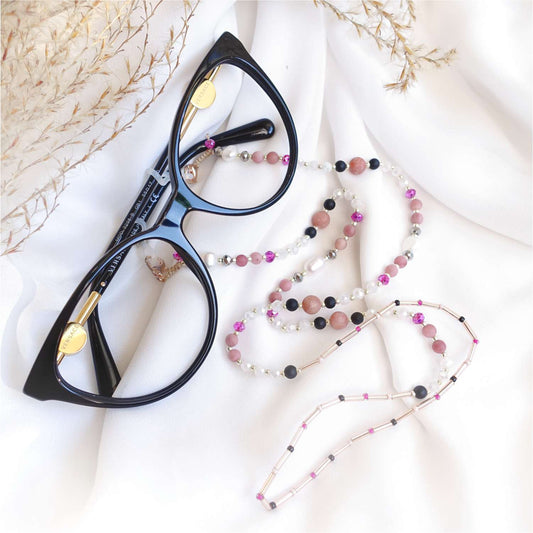 Pink glasses chain with natural stones onyx, rhodonite, agate, LadyPink EGC516