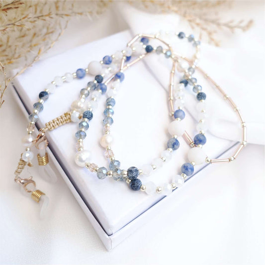 Glasses chain with natural stones blue agate, pearl jade, sodalite and pearls, Cracked Blue EGC503