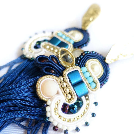 Oriental beige blue soutache earrings 325 Dubai with fringes