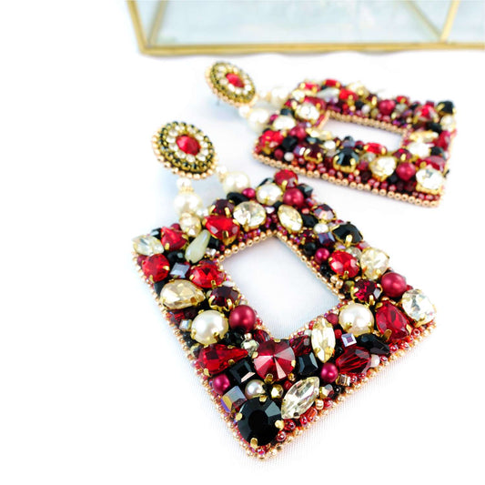 Red and black rectangular earrings with crystals 609 Donna