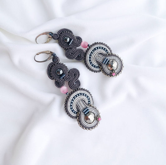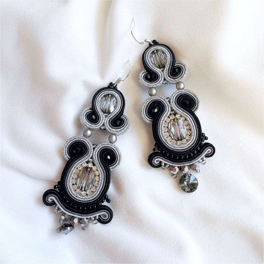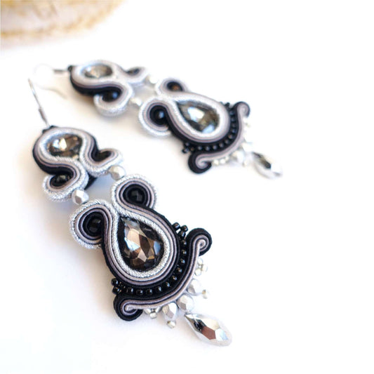 Gray-black soutache earrings with crystals 178 BlackSilver II