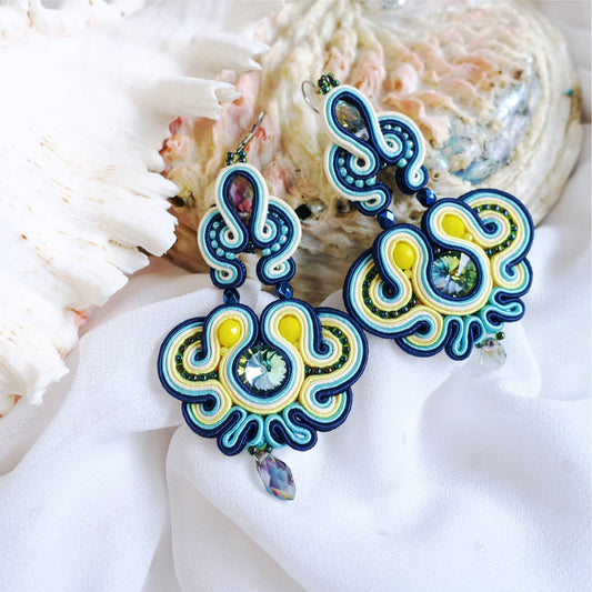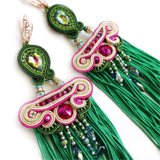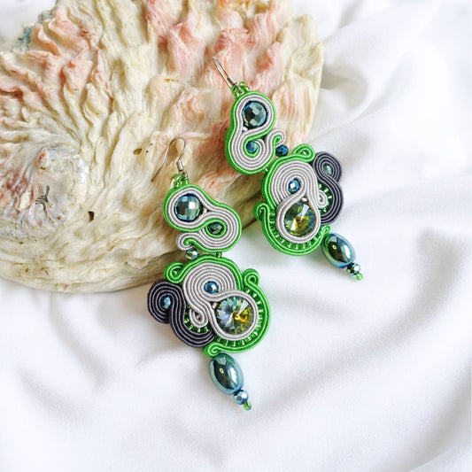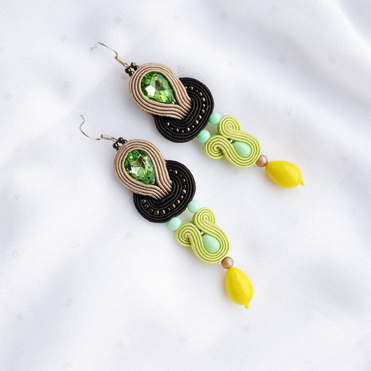 Green and yellow medium length soutache earrings with crystals, 177 Hemlata