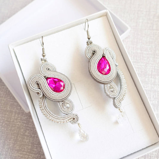 Silver pink soutache earrings with fuchsia crystals 31 Maria