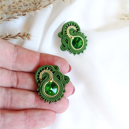 Green Soutache Hoop Earrings with Pearls and Crystals, 301 Green Gold