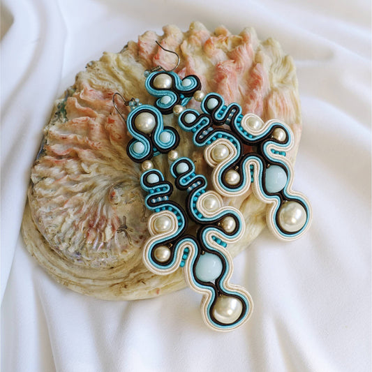 Turquoise hanging soutache earrings with pearls 129 Aisha