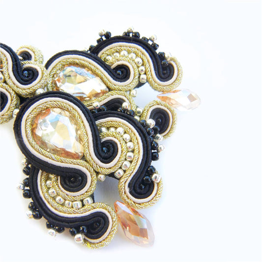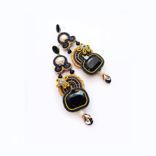 Small black and gold soutache earrings on the ear, 169 Aurora