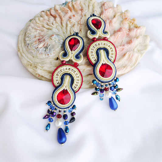 Oriental beige blue soutache earrings 325 Dubai with fringes