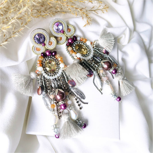 Silver purple soutache earrings with jadeites and fringes, 411 Ramala